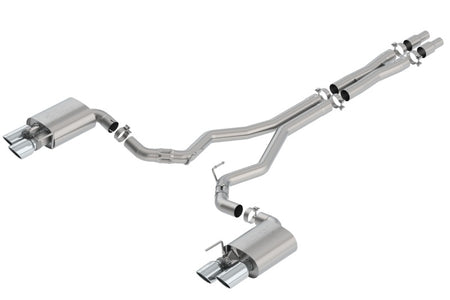 System will fit Bullitt models. NOT recommended for use on Convertibles. 3" diameter system contains a merge X-Pipe for increased performance and improved sound. System has Sound Suppressing exhaust valves. System features Borla(r)'s Polyphonic Exhaust Harmonizer which utilizes patented units that contain pipes of different diameters and lengths to create multiple exhaust notes that harmonize to deliver a clean, rich, full-bodied sound to the Borla(r) mufflers. The mufflers then enhance this sound to the character and volume appropriate for our Touring, S-Type and ATAK(r) systems. This system features bright chrome on T-304 stainless steel tips. Borla(r) Cat-Back(tm) and Axle-Back multi-core technology is designed to unleash hidden horsepower. Increased exhaust velocity adds power, driving excitement, fuel economy, and the distinctive Borla(r) Sound of Power respected by motoring enthusiasts everywhere. Each system is built from premium T-304 stainless steel, superior to T-400 series knockoffs (such as 409), to give you the absolute best in performance and durability. Ultra-smooth mandrel bends ensure maximum flow& power, and precision computer-controlled CNC manufacturing ensures an accurate fit Best of all, Borla(r) stands behind every system with a Million-Mile Warranty. Just what you'd expect from the world's most experienced (and most winning) exhaust brand.