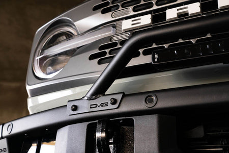 DV8 Offroad has designed a tubular bull bar for the Bronco's factory steel bumper that sits much lower in front of the grille than the OEM version, giving it a low profile appearance. The tube features 2 adjustable light mounts that allow for LED lighting to be mounted above or below the bar. Lighting options include mounting up to a 20-inch light bar above or below the tube, or a pod/round light on each of the 2 tabs. The mounting plates are constructed of 3mm steel, and the bar is made from 1.5-inch diameter x 1.5mm thick steel tubing. Installation is a simple half-hour process that utilizes the 8 factory bolts already present on the Bronco's steel bumper.