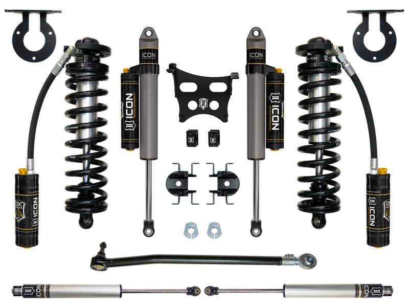 This ICON Vehicle Dynamics 2.5-3” coilover system is a great way to lift your 4WD 2023 Ford F-250/F-350 Super Duty while drastically improving ride quality and performance. The Stage 4 system is perfect for on-road and off-road use including towing, job site duty and general off-road adventure. The advantage of utilizing a coilover conversion kit is that they have been designed to increase the overall damping ability of the vehicle while at the same time allowing for user-defined ride height adjustment. The 2.5" Remote Reservoir Coilover featured in these kits is based off ICON’s 2.5 VS Series shock line - meaning that features like ICON engineered coil springs, FK Rod End bearings, and vehicle-specific valving come standard. ICON's Stage 4 System is comprised of ICON 2.5 Series CDCV remote reservoir coilovers with adjustable ride height, dual steering stabilizer kit with ICON 2.0 Aluminum Series stabilizers, on-vehicle adjustable front track bar, and ICON CDCV 2.5 Aluminum Series piggyback reservoir rear shocks, for those desiring an easy way to tune the ride externally with 10 settings, from soft to hard. With the endless hours ICON has spent testing and tuning our suspension components and shocks as a complete package, you can rest assured you have the best suspension solution on the market.