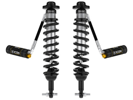 ICON Vehicle Dynamics V.S. 2.5 Series remote reservoir front coilover shocks with CDCV are an incredible upgrade for the front end of the 2021-2023 Ford Bronco. These adjustable coilovers allow up to 3-4” of lift height adjustability on Broncos without the Sasquatch package or 2-3” of lift over stock Sasquatch equipped Broncos, allowing the use of larger, more aggressive wheel and tire combinations. ICON’s Vehicle-specific shock length and valving along with the larger 2.5” shock body and increased piston area over stock components yield the maximum travel possible along with superior ride quality and suspension performance both on- and off-road. Reservoirs greatly increase shock oil volume and heat dissipation surface area to resist overheating and cavitation under hard use, which can lead to damper fade. ICON's exclusive Compression Damping Control Valves are included for precisely dialing in your suspension performance. CDCV controls fluid flow under compression, allowing you to achieve the perfect tune whether driving on the street, slow-crawling through the rocks or mobbing across the desert at full throttle. When paired with ICON 2.5 Series rear coilovers vehicle control will be balanced front to rear, resulting in the best overall driving experience for your Ford Bronco.