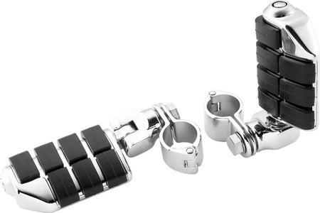 Utilizes a unique offset mount to allow riders a range of adjustment not possible with other clamp-on style highway pegs. Offset can be rotated 360 degrees in a 4 in. diameter circle to accommodate tall, short or average height riders. Can be installed on any round tubing (frames or engine guards), but it is important to keep in mind that the footpeg will end up perpendicular to the bar to which it is mounted. If your engine guard is angled in such a way so that the peg will not be level once installed, look at the right angle mounts and male adapters with adjustable stop.