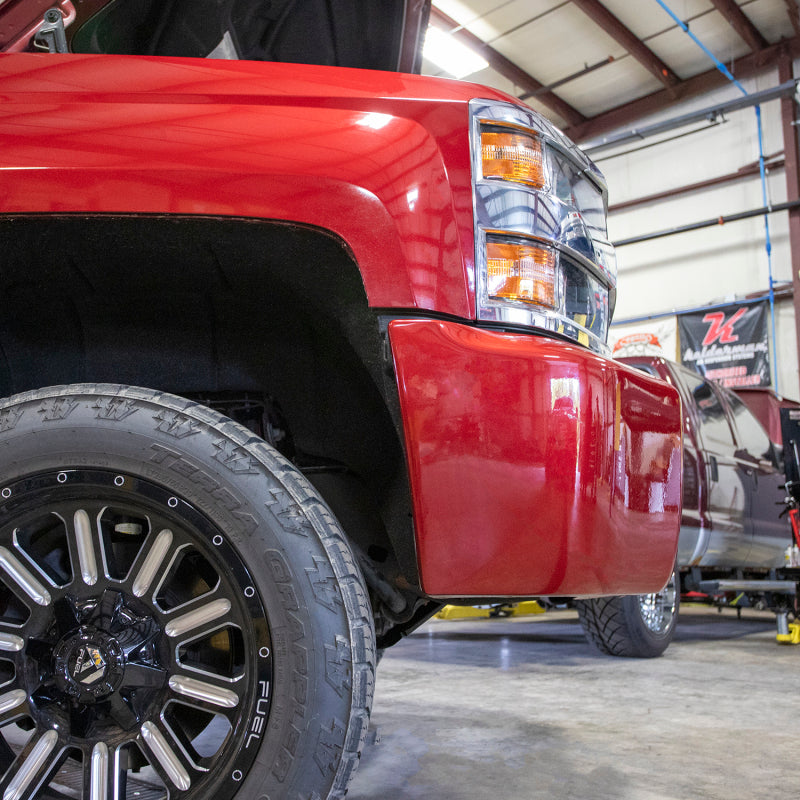 2015-2019 Silverado and Sierra 2500HD / 3500HD CNC machined billet aluminum spacer kits from WCFab move the front bumper forward, keeping it off the frame horns 3/4 of an inch while maintaining the maximum mounting surface area for structural integrity. Moving the bumper forward allows for the fitment of wider and taller wheel and tire combinations with a more negative offset. It prevents or reduces the need for additional trimming of OEM components. - - Finished in a Flat Black powder coat for additional corrosion resistance and OEM-like appearance. - - Installs easily with basic hand tools. - - For less aggressive fitments, please see 3/8" Spacer Kit part number WCF100453